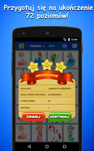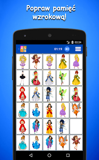 * Księżniczki - gra pamięciowa dla dzieci ma prosty i intuicyjny interfejs, który jest łatwy w użyciu i obsłudze. Darmowa gra pamięciowa jest również zoptymalizowana pod kątem tabletów, dzięki czemu Twoje dzieci będą siedzieć cicho, jednocześnie świetnie się bawiąc w samochodzie, w restauracji, czy gdziekolwiek indziej.