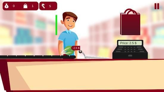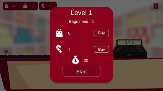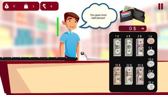 When the level starts, the shopping panel opens, where the player, if necessary, can buy bags and sweets. The cashier must serve customers, memorizing the prices of goods and putting them in mind, and then inform the amount of the purchase to the client. Having received money for the purchase, he must in his head count the change and give it to the client.To pass to another level, the cashier must serve all clients until their patient tolerance scale is exhausted. The scale can be reset using sweets.