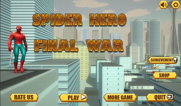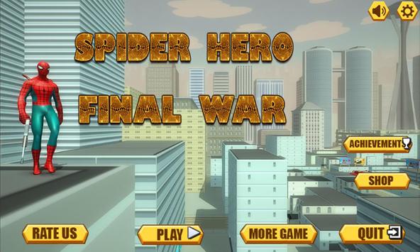The game play of this Spider Hero: Final War is that there will be 30 missions in the whole game and you would be the spider hero to fight against the different enemies like incredible superhero, incredible girl, captain shield and dual sword rope hero etc.
