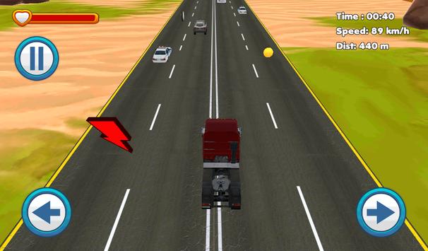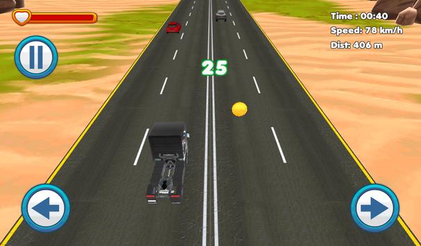 Your mission is simple - to have fun! You can drive 6 trucks through game and speed through endless miles of road. But the trick, of course, is to avoid traffic and get as far as you can. Along the way you'll be able to collect pickups - coins for cash, energy for boost and clock for time. Avoid oil splashes though as you will loose control over car for a brief moment if you run over it.