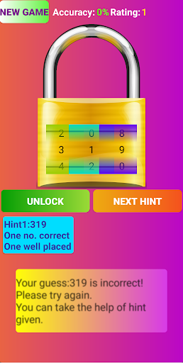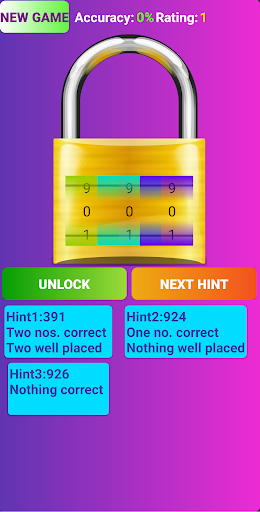Jest układanką matematyczną (numer).Tutaj otrzymasz blokadę, która jest zablokowana z kodem trzy cyfrowym.Musisz go odblokować, zgadując 3-cyfrowym kodem.Musisz ustawić swój kod domysłowy na zamek, przesuwając odpowiednią liczbę 3-cyfrowego kodu.