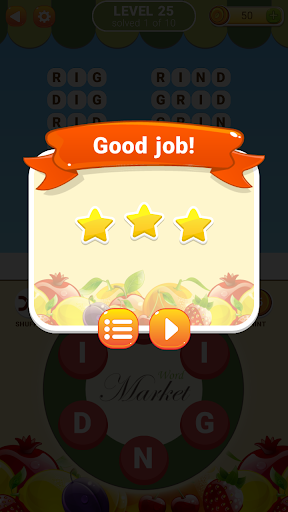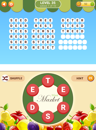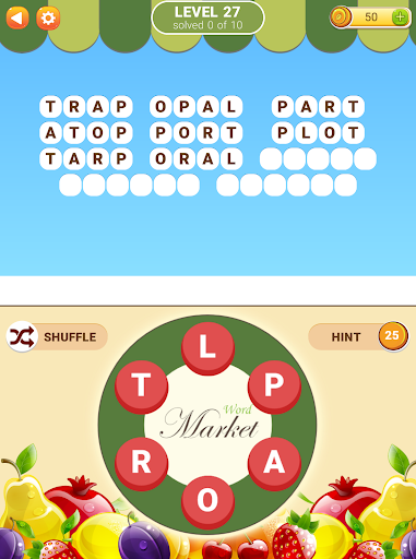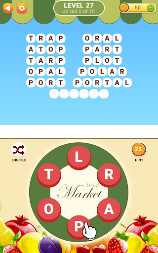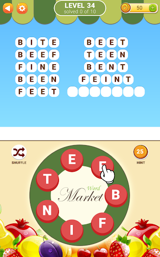 Second installment of the popular Word Market game with brand new set of puzzles. New in this game: you can now redeem hidden words for extra bonus coins. Swipe your finger over the letters on the plate to form a word and unlock a fruit. Apples, strawberries, oranges, plums... Healthy! Guess all the words, give your brain some vitamins!