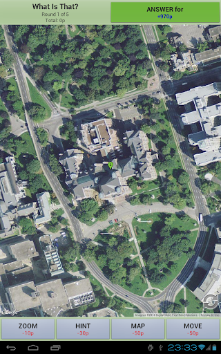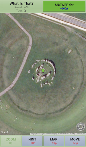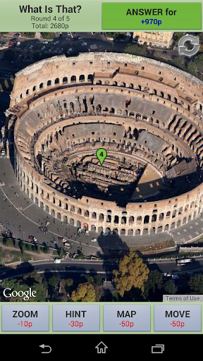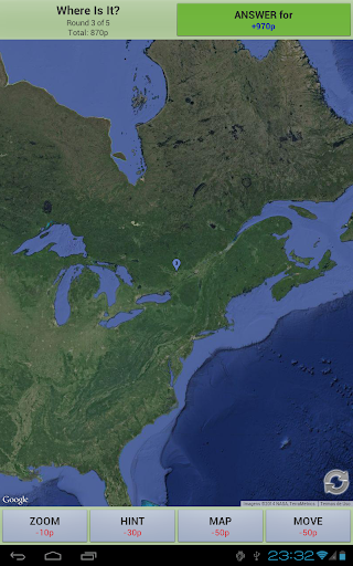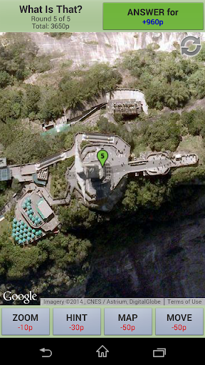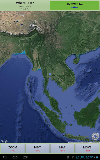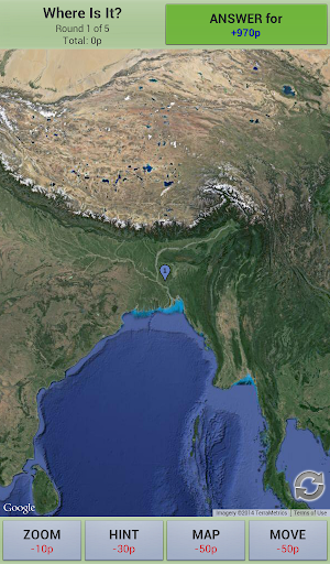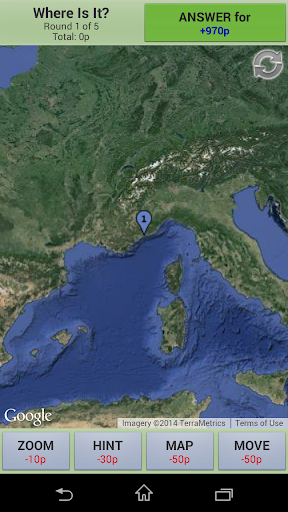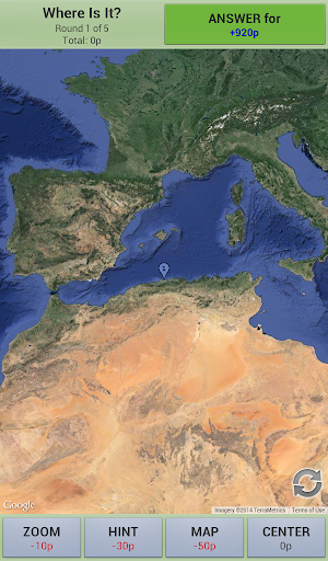 To make things easier, you may ask for hints, move the map, zoom in/out and change between satellite and map mode. Any help action cost some points, so the less help you ask, more points you get!