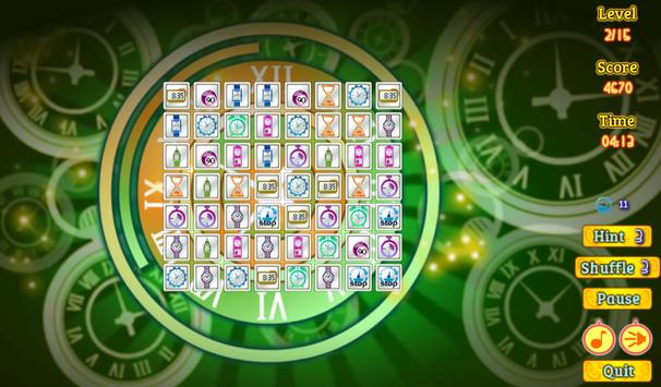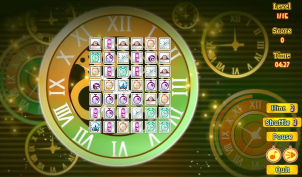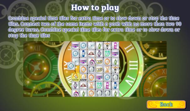 Mahjong connect game with special time tiles. Collect the special tiles as fast as possible for extra time and bonus points. Connect 2 of the same items with a path with no more then two 90 degree turns. Combine special time tiles for extra time or to slow down or stop the time tiles.