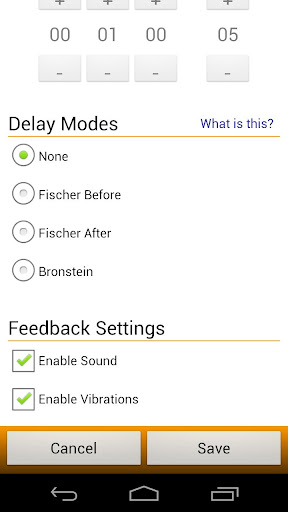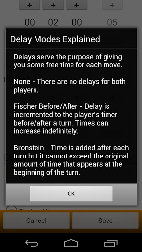 - Tryby opóźnienia: Fischer przed / po tymczasie Tryby timera Bronstein Chess