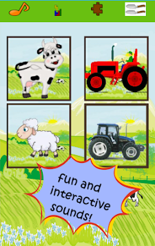Simply tap on the moving pictures of tractors, farm machinery, sheep, cows and pigs, and hear the sounds!