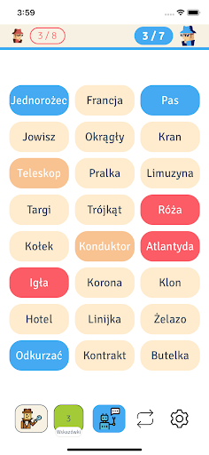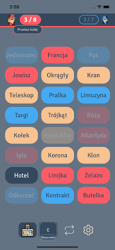 Na początku gry na planszy będą 12, 18, 24, 30, 36 lub 42 karty (w zależności od wyboru) z różnymi słowami. Górny pasek wskazuje, która drużyna rozpoczyna grę.