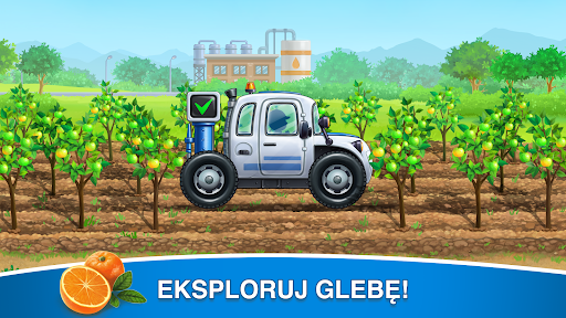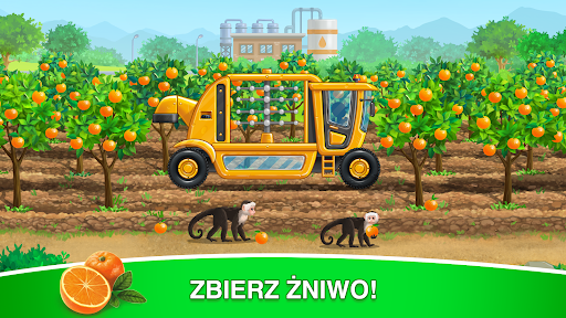 Gra dla dzieci odkryje przed młodymi rolnikami pełny cykl zbioru pomarańczy. Najpierw dzieci składają ciężarówki z puzzli, myją pojazdy, tankują je na stacji benzynowej iw razie potrzeby naprawiają na stacji paliw. Mali farmerzy będą kierować dużymi siewnikami i opryskiwaczami, zraszać wodą ze zraszaczy oraz kierować traktorami i ogromnymi kombajnami! Dzieci zbiorą również całe zbiory cytrusów i wyślą je do sokowirówki, aby otrzymać gotowe produkty do sprzedaży! Każdy krok w grze edukacyjnej dla dzieci obejmuje nową ciężarówkę lub samochody i pokazuje określony etap pracy z sadem cytrusowym.
