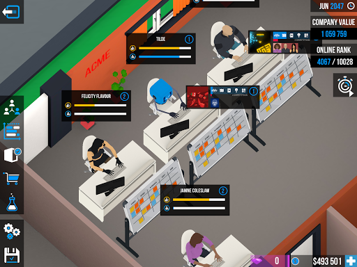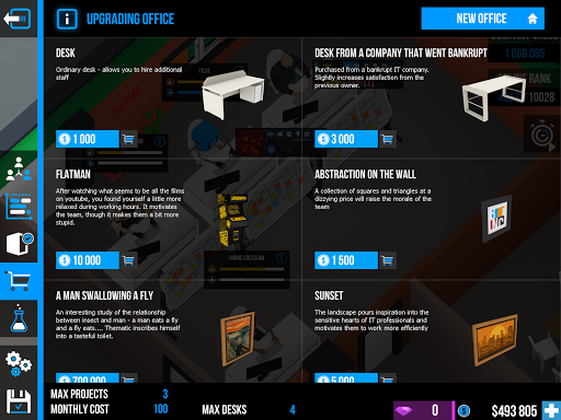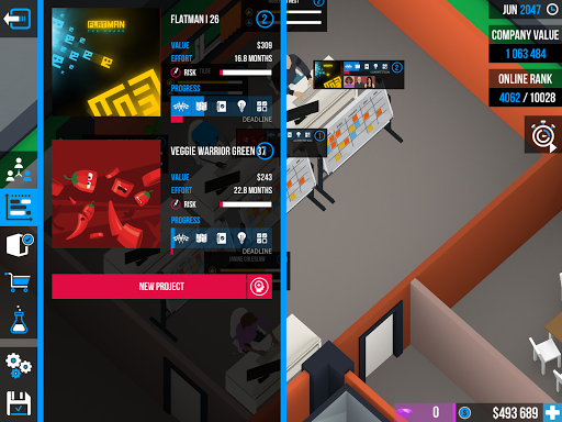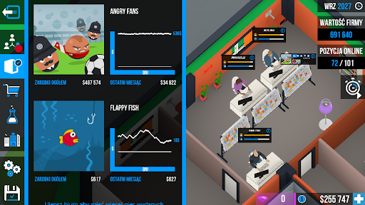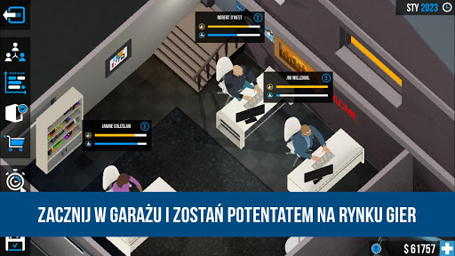 To NIE jest clicker! Tu możesz zbankrutować, jeżeli nie masz kosztów i ludzi pod kontrolą. Ale możesz też zacząć ponownie, ponieważ to jest tylko symulacja. :) Zatrudniaj pracowników, realizuj dziesiątki projektów i zarabiaj pieniądze na słynnych grach mobilnych takich, jak: Flara Bimbo, Angry Fans, czy niepoprawna politycznie Race of Races. Szkól swoich pracowników, wypłacaj im premie, wyposażaj biuro w dziesiątki użytecznych przedmiotów, jak stół do bilarda i ekspres do kawy. Zmieniaj lokale biurowe jak rękawiczki - od starego garażu do luksusowego biurowca w centrum miasta.