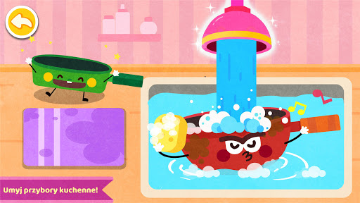 Przybory kuchenne są bardzo brudne. Zrób im prysznic. Wyciśnij detergent na gąbkę. Nałóż delikatnie na przybory kuchenne, a zabrudzenia znikną!