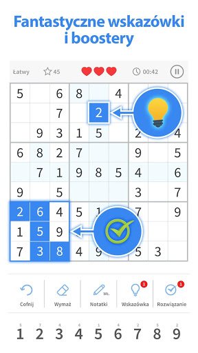 - Wskazówki - kiedy utkniesz, użyj wskazówki i uzyskaj rozwiązanie sudoku tylko dla tej komórki.