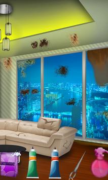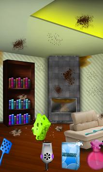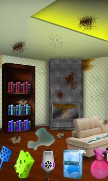 In the first part of the game you need to use the flyswatter to remove the flies, the sponge to dry the water from the floor and the vacuum cleaner to remove all the dust. For the ugly brown stain use the detergent and wash off the mud using water. Move on to the other side of the room and clean the stains using the detergent and the mud using water. Use the green gel to clean the mold and the blue gel to remove the brown spots. Finally sew the couch using the needle and the job is finished. You managed to create a cozy and welcoming room instead of the old and messy room. Great job!