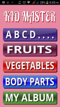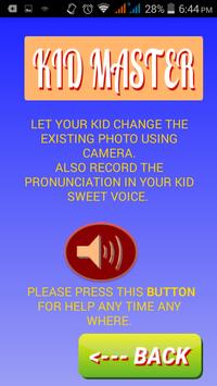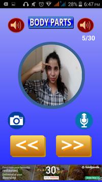 This app help kids learning alphabets, Body Parts, Fruits, Vegetable with the help of images. Kids can change the images as per his/her choice. Also, Kids can change the pronunciation of images in their own voices using the camera & record buttons.