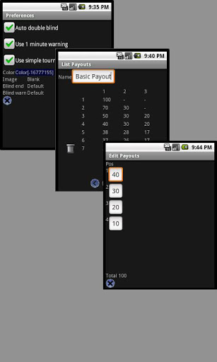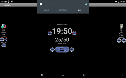 Once defined, they are available to use at any time to start your poker tournament and keep track of the blinds, next blinds, bounty, number of players, number of players left and even a suggested payout that you can adjust.
