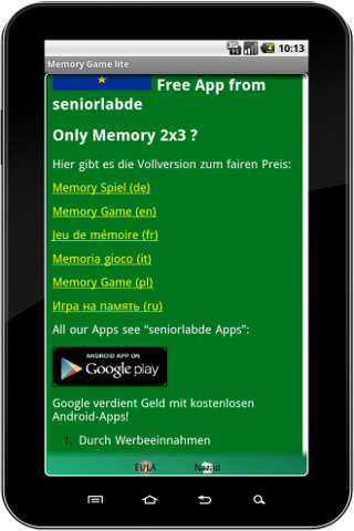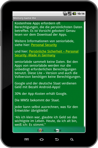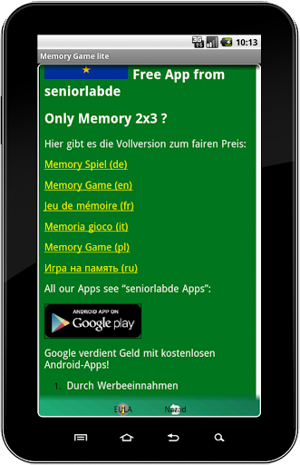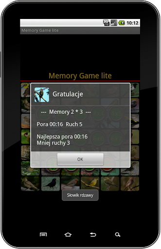 Kto jest najszybszy i który wymaga najmniejszej ilości ruchów do rozwiązania. Każde rozwiązanie jest oceniane i zapisywane. Od 38 różnych rodzimych w Niemczech ptaków śpiewających gra pamięciowa jest połączone przez przypadek. (Rozmiar pamięci - Lite Version 2x3) Znowu i znowu cieszyć się grając z efektem uczenia się dla młodych i starych. W zależności od Twojego smartfona, tabletu lub pamięci wielkości jest rozgrywany zmiennej wielkości obrazu. Miłej zabawy seniorlabde