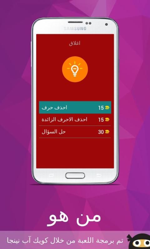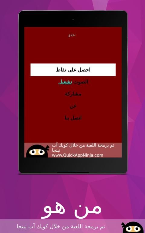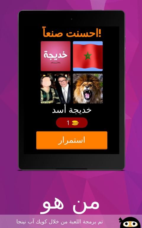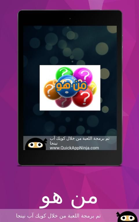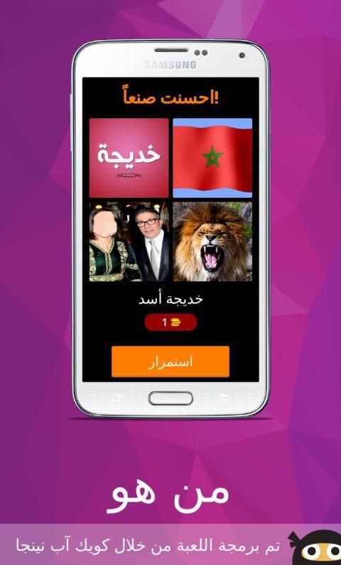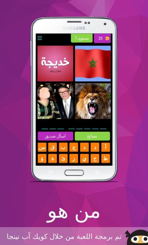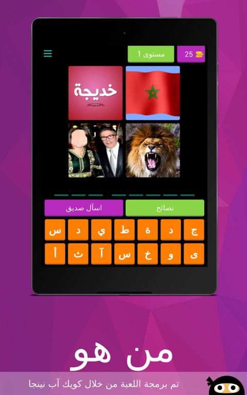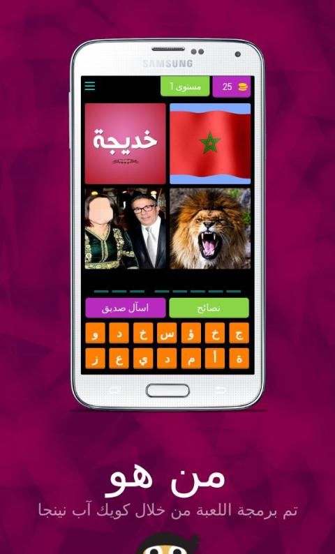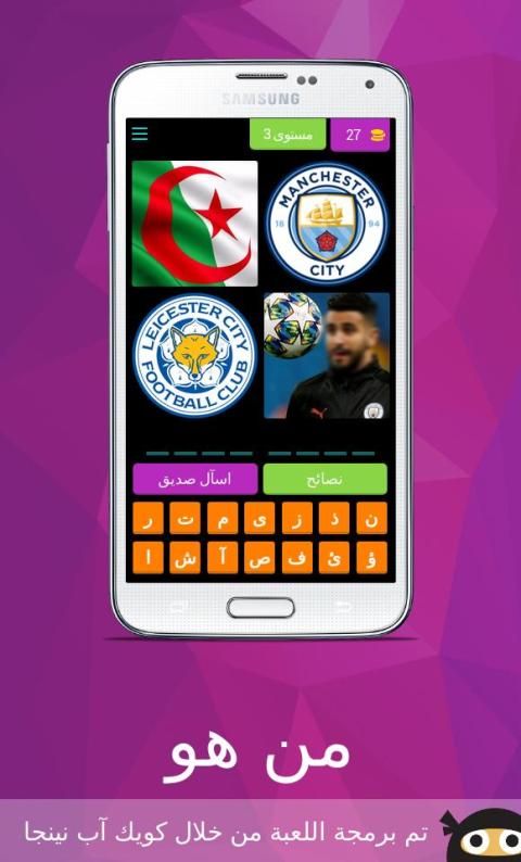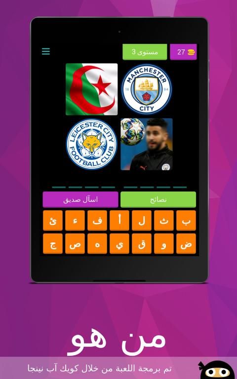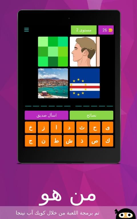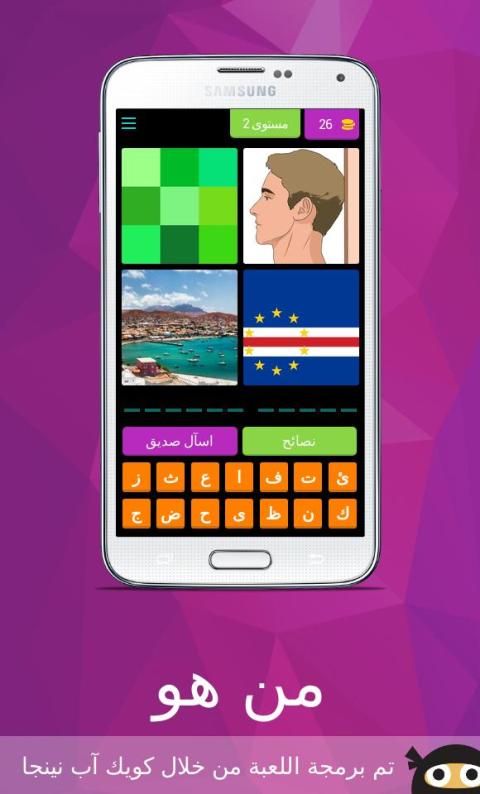 لعبة من هو لعبة ذكاء و تحدي لتعرف على مشاهير ، مبنية على فكرة الكلمات المتقاطعة وصلة تحتوي على ألغاز مصورة صورة و لغز صعب و سهل مع الأجوبة الحل ستختبر معلوماتك في مجالات لتعرف على عدة مشاهير كرة القدم ، الفن، السياسة و ........من خصائص اللعبة أنها ستعرض عليك أربع صور يجب عليك أن تحزر إسم اللاعب او الدوله او احد المشاهير من خلال كتابة إسمه الصحيح ، إذا لم تتعرف على إلاسم لا تقلق يمكنك إضهار الحرف الأول للاعب أو إخفاء ثلات حروف .