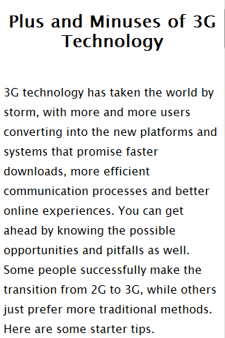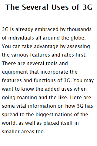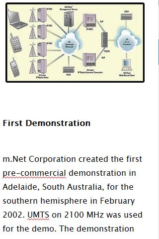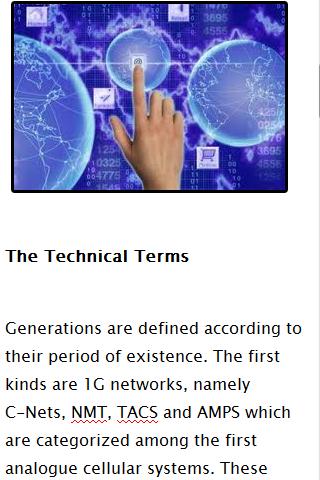 3G, short for third Generation, is the third generation of mobile telecommunications technology. 3G telecommunication networks support services that provide an information transfer rate of at least 200 Kbit. However, many services advertised as 3G provide higher speed than the minimum technical requirements for a 3G service. Recent 3G releases, often denoted 3.5G and 3.75G, also provide mobile broadband access of several Mbit/s to smart phones and mobile modems in laptop computers.This app consists of 3G Demonstrations,3G History and background 3G Uses and Features,About the CDMA2000,Advantages of 3G.Q: Why does it need INTERNET permission?A: This is a free app; we need ads to support our work.tags Mobile 3g, 3g review, iphone 3g review, advantage of 3g, 3g Technology, about3g technology, 3g features, feature of 3g, advantage of 3g,What is 3g, what is 3g Network, What is 3g Technology.