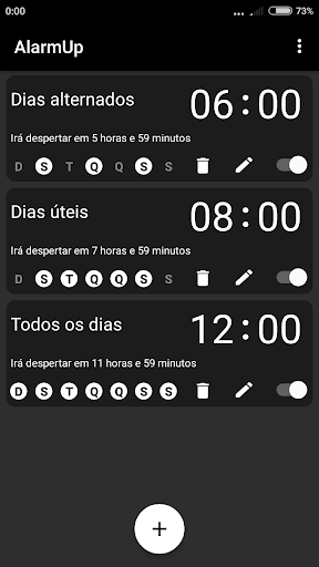 Tenha em mãos também o único alarme para dias alternados disponível na Play Store. Com está funcionalidade seus alarmes se ajustarão automaticamente despertando dia sim dia não, não precisando você ficar reconfigurando o alarme toda semana, basta configurar uma vez e pronto, ele automaticamente atualizará os dias a cada dia que desperta.