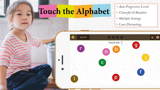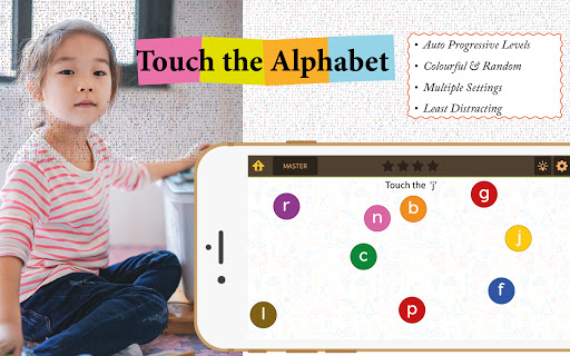 Touch the Alphabet is a simple activity game that displays 3 alphabets and asks the kids to touch the correct one. Upon 5 consecutive correct attempts, the level increases and the kid has to choose from more and more alphabets.