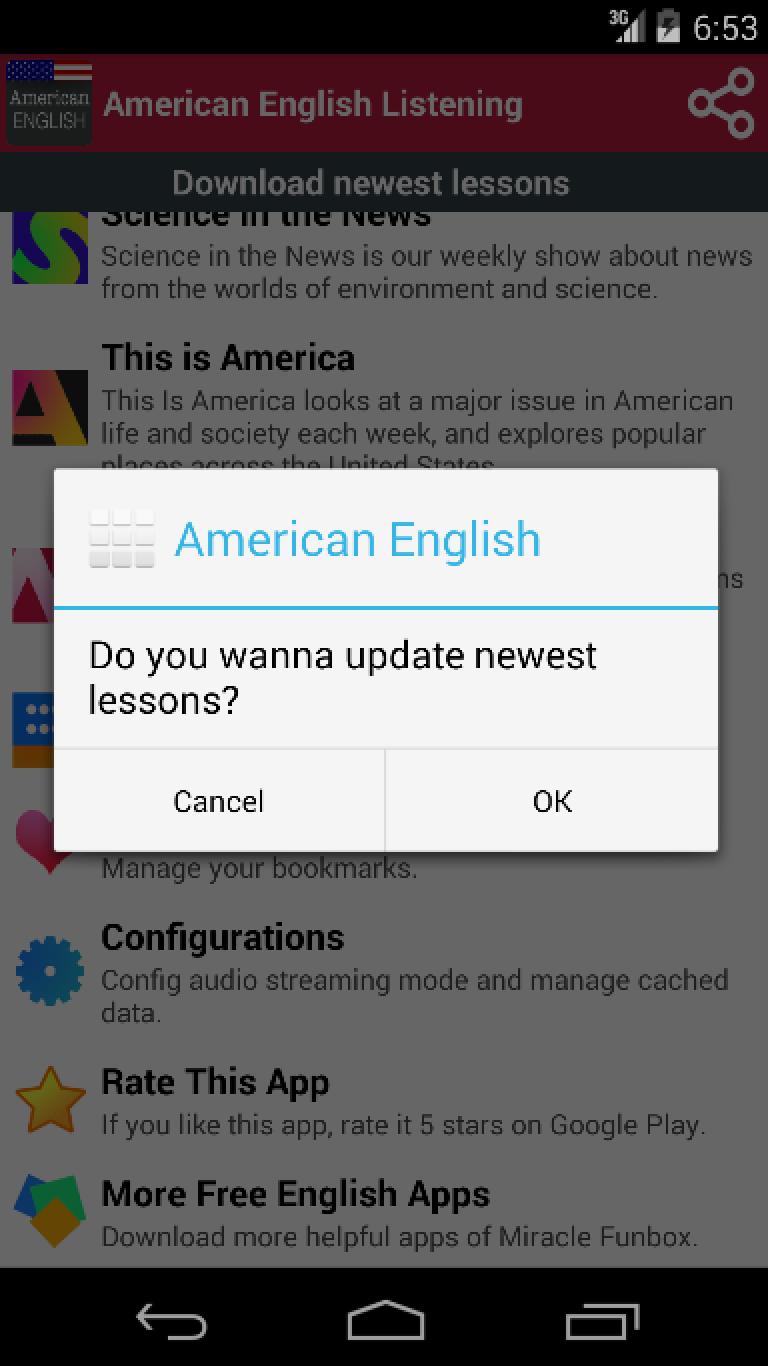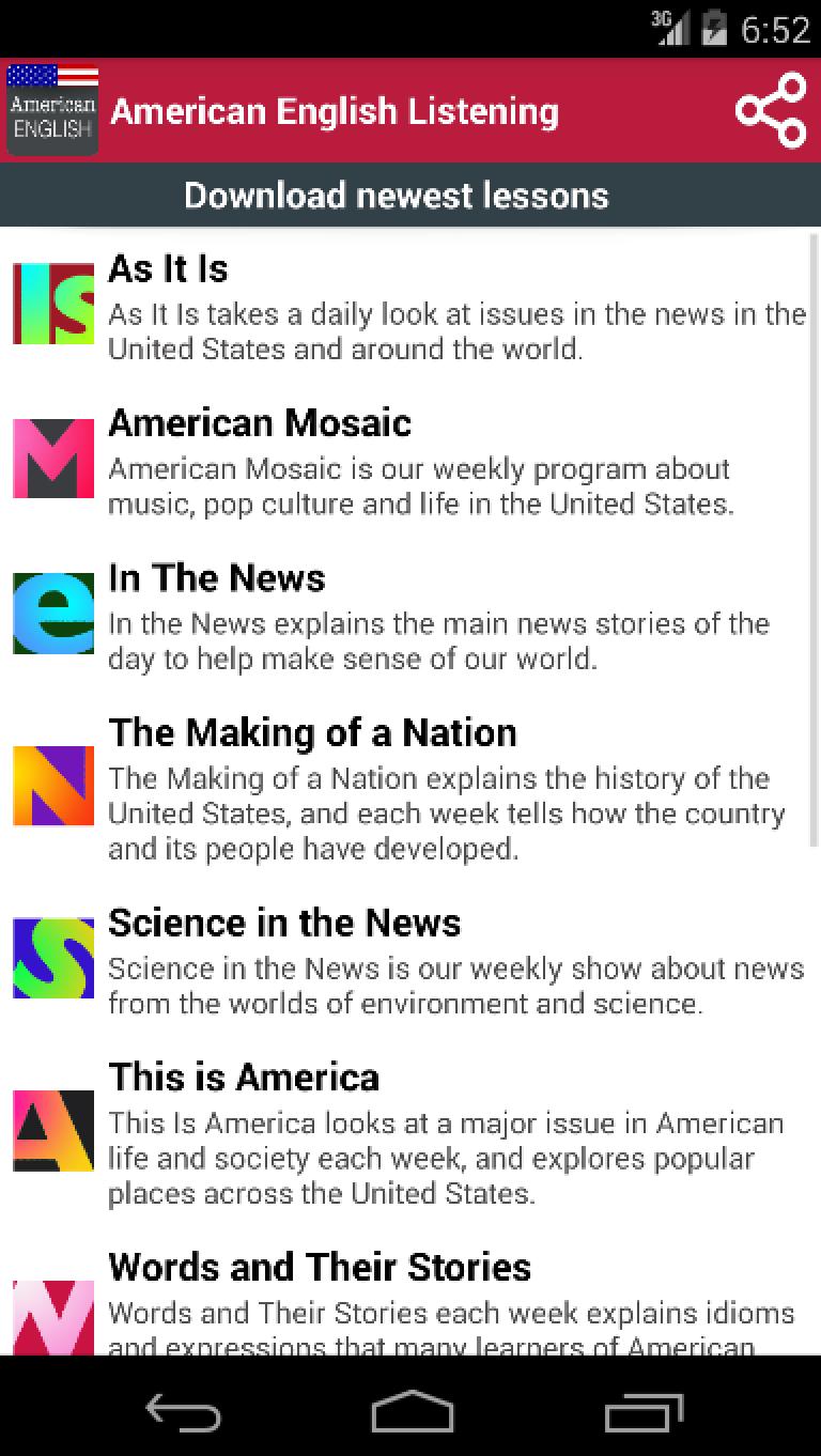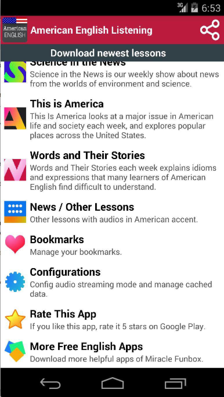This free app contains thousands of English listening lessons whose audios are in American accent. If you study by daily reading and listening to every lessons in this app, you’ll get your English more confident in reading, listening and speaking abilities. All audios of this app are in American English accent.