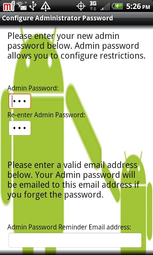 A handy app that you would love to use before handing your phone to the kids.Android Parental Control app is designed to restrict access to selected Apps:1 Select and filter installed apps2 Overall and individual app restriction3 Automatic restart of the app when phone is rebooted4 Safe Sandboxonly show allowed apps5 Password reminder emails admin password to the configured email address6 Automatically launch an allowed app in Sandbox mode newKw: app protector,protect app,secure lock, security, password, locker, safe, safety, sandbox, app locker, automatic launcher auto launcher, automatic launch, auto launch