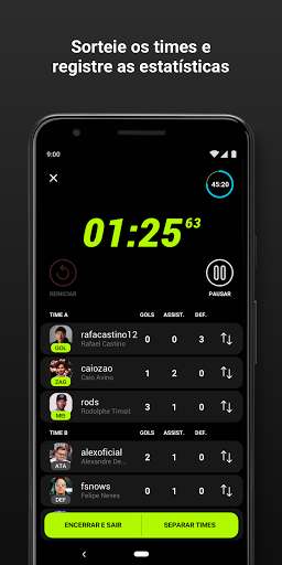 Após organizar e sortear times ou encontrar uma partida de futebol society, você já pode jogar bola. Dê e receba notas dos outros jogadores em quadra por sua performance em campo durante a partida. Só não esqueça de fazer a reserva de arena!