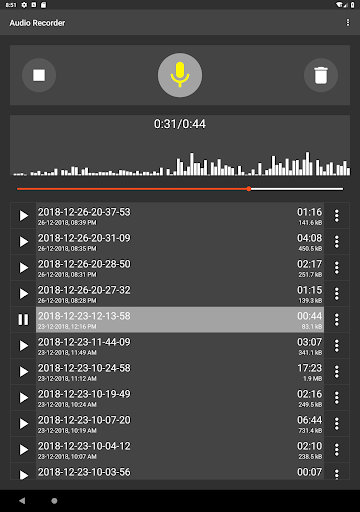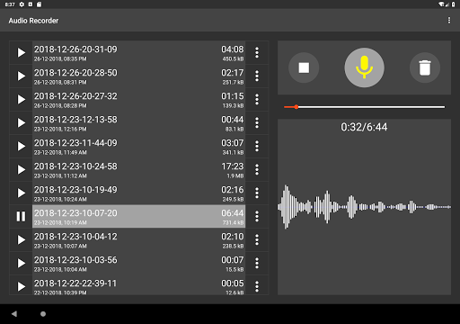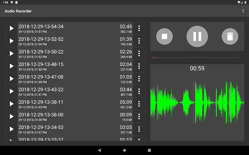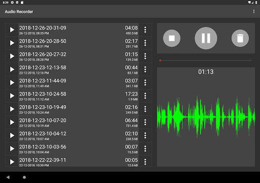 O design deste áudio O aplicativo de gravador é muito simples e fácil de usar. As gravações podem ser iniciadas e jogadas na mesma tela. As gravações são mostradas na lista, nova gravação são mostradas na parte superior da lista (ordenada por data).