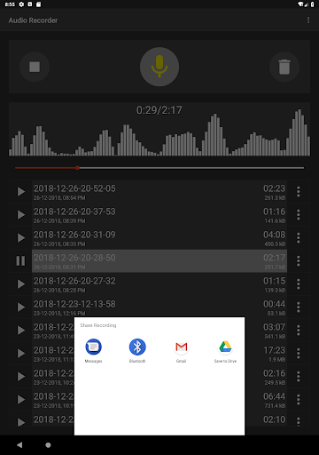 O usuário pode compartilhar as gravações nas opções de compartilhamento disponíveis (Bluetooth, e-mail ... etc)
