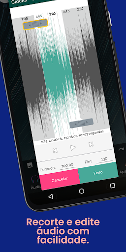 O Audio Status Maker fornece recursos de edição de áudio sofisticados e fáceis de usar que facilitam a criação de seu status. Suporta muitos formatos de áudio populares como MP3, AMR, WAV e M4A. Inclui um aparador de áudio e um visualizador de áudio embutido com cinco níveis de zoom diferentes que permitem que você escolha qualquer parte do áudio para definir o seu status.