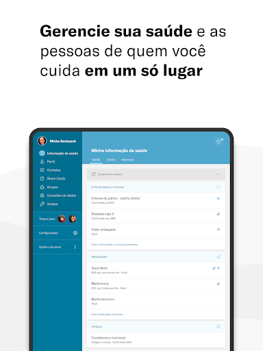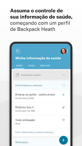 • Enfermidades, intervenções, medicamentos, alergias, cuidados complementares, laboratórios, resultados genéticos, e muito mais – se são informações importantes para cuidar da sua saúde, guarde-as na sua Backpack