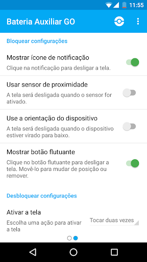 Este aplicativo permite que você bloqueie e desligue a tela completamente sem parar o processo de Jogo/aplicativo. Neste caso, você pode colocar o smartphone no seu bolso e caminhar sem medo de toques indesejados na tela. Além disso, você pode salvar a vida da bateria, colocando a tela em um estado de energia mais baixo.