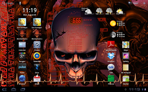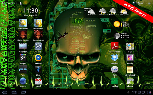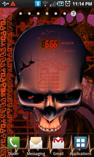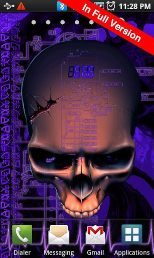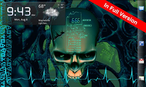 Alien Biomechanical Skull live Wallpaper with Retro Glowing and Scrollling FXLive Wallpaper with an Alien Biomechanical Skull, with retro glowing and scrolling effects For fans of horror, scifi, alien technology.Also optimized for Honeycomb Tablet devices.Implemented with OpenGL for efficiency, and a CPUBattery saving setting is provided.A collaboration featuring the artwork of artist Cat Spencer.check out the Donation version for 5 color choices and more configuration optionsPlease contact us with feedback or if you encounter any issues, unfortunately there is no facility to respond to market comments.