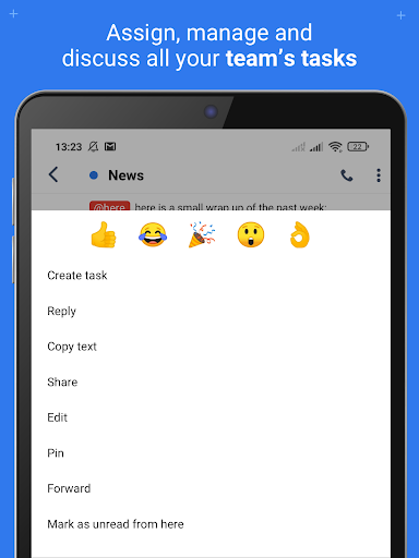 - Outros recursos de colaboração de equipe: Usuário e equipe @Menteions, GIFs e emojis, status on-line, ações de conversa e muito mais