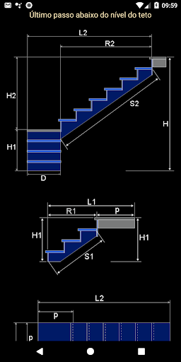 Ideal para calcular e construir escadas de concreto, escadas de madeira, escadas de ferro, escadas retas ou com uma volta a 90 graus e 180 graus.