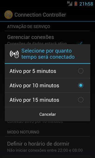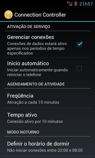 Esta aplicação permite que você gire conexões de dados (3G/WiFi) de acordo com os períodos de tempo configuráveis, e também pode definir uma noite onde você quer ter nenhuma atividade na rede de dados.