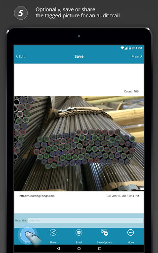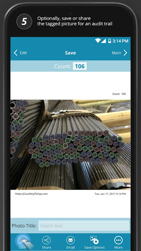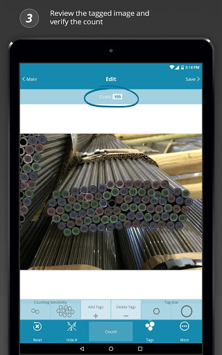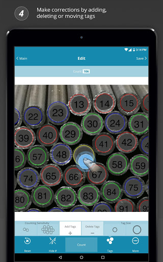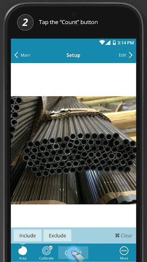 Agora você pode contar pilhas de tubos ocos e tubos rapidamente do seu dispositivo móvel.Basta abrir o aplicativo CONTPIPES, tire uma foto da pilha que você gostaria de contar e pressionar o botão "Contagem".