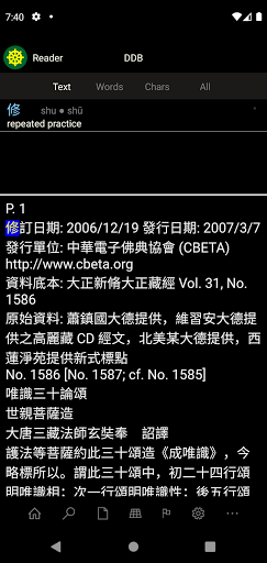 ddb (dicionário digital do budismo) e cjkv-e (chinês clássico) são obras colaborativas editadas por Charles Muller.O DDB Access fornece acesso ao DDB e CJKV-E do seu dispositivo Android.