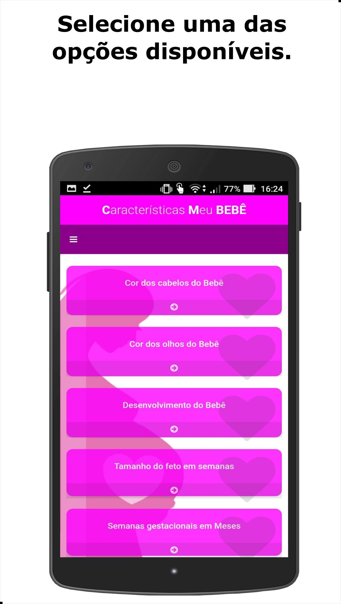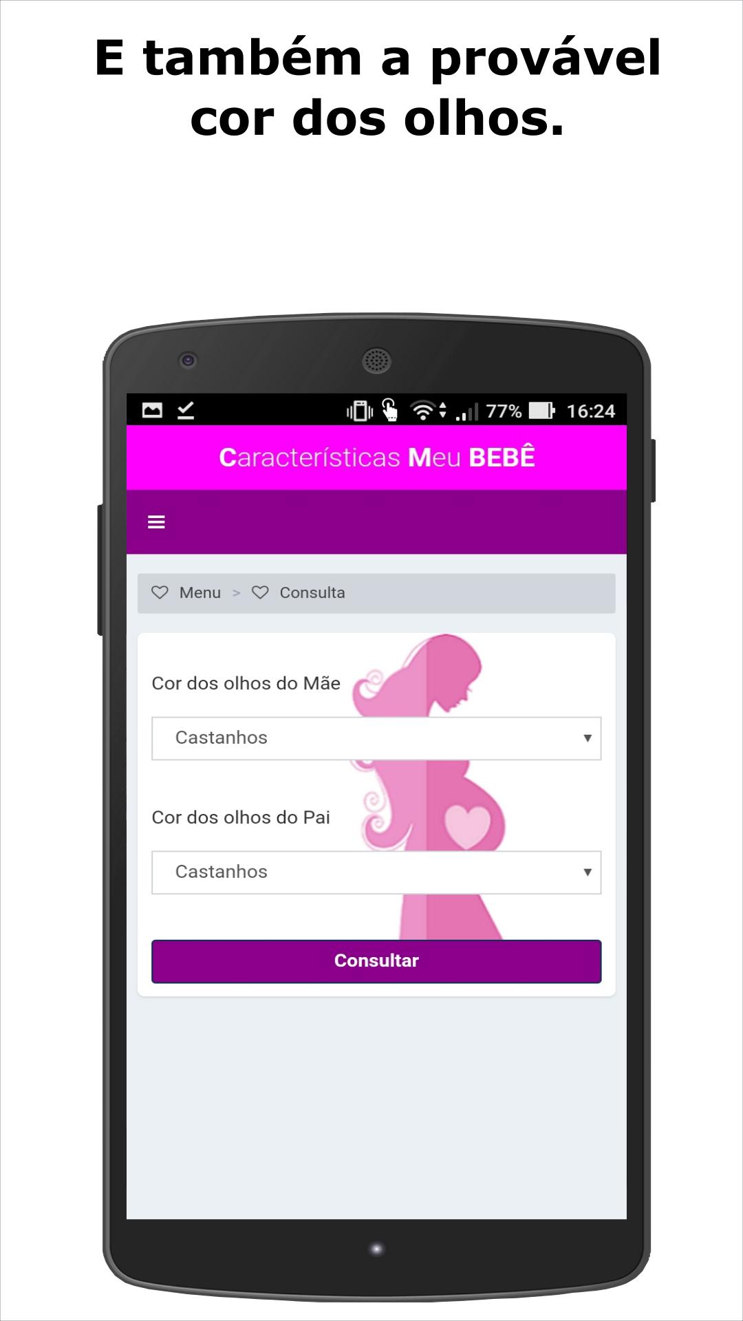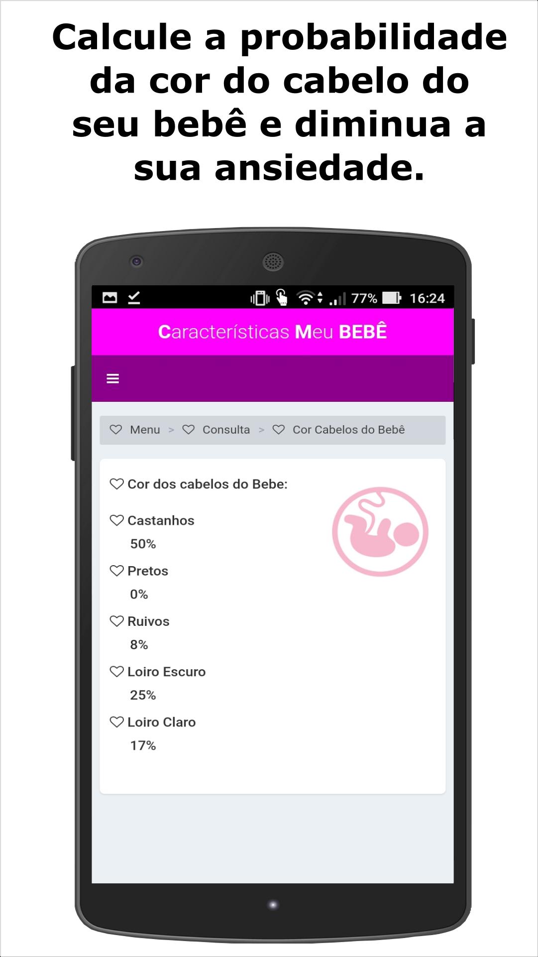 Guia Características do Meu Bebê - Gestação apresenta um conjunto de ferramentas para que você verifique a probabilidades e saiba como serão determinadas características do seu bebê, como cor dos olhos, cor do cabelo, altura.