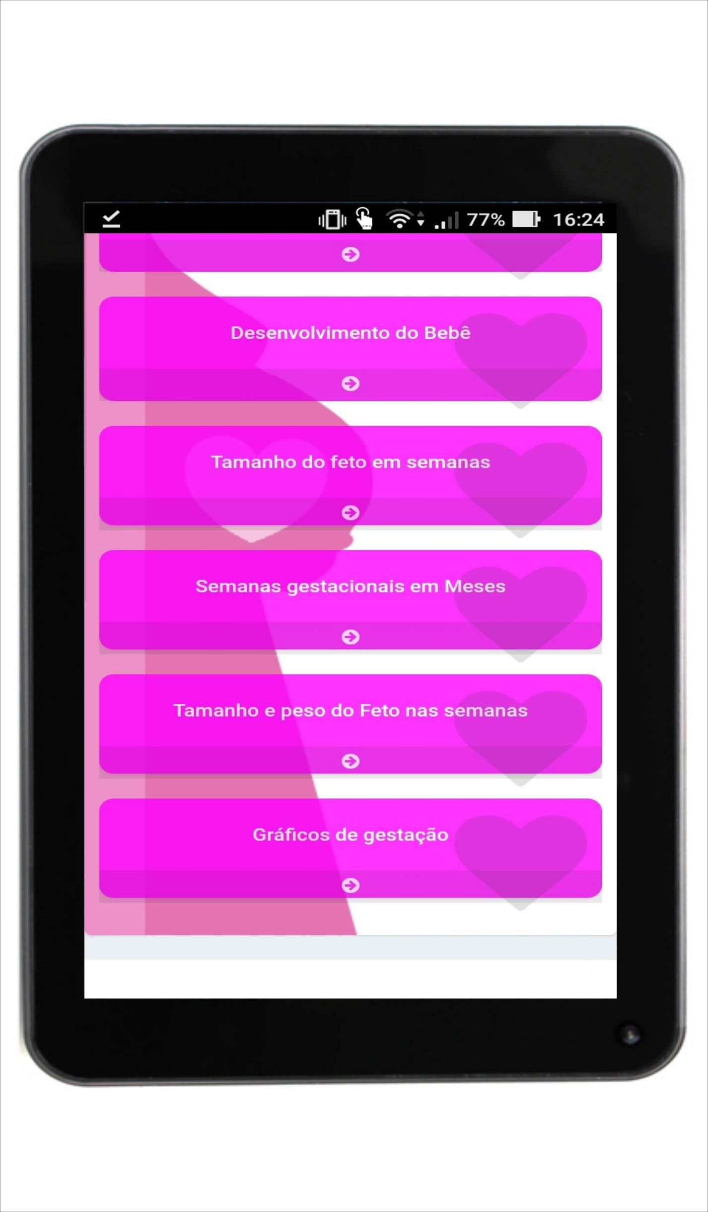 - Nesta opção é apresentada a tabela do tamanho esperado do feto para a semana gestacional, com isso você poderá visualizar e comparar com o apresentado na sua gestação. É importante informar que pequenas variações podem ocorrer de mãe para mãe.