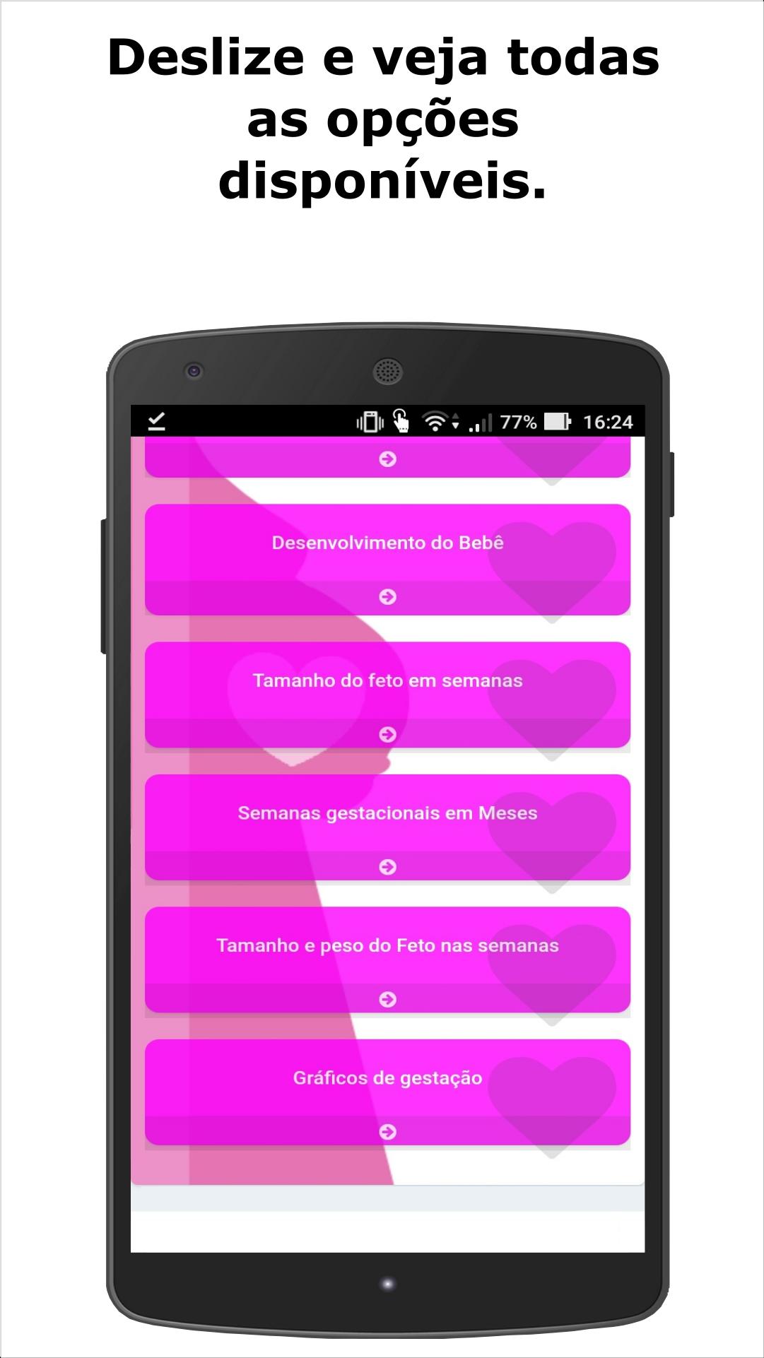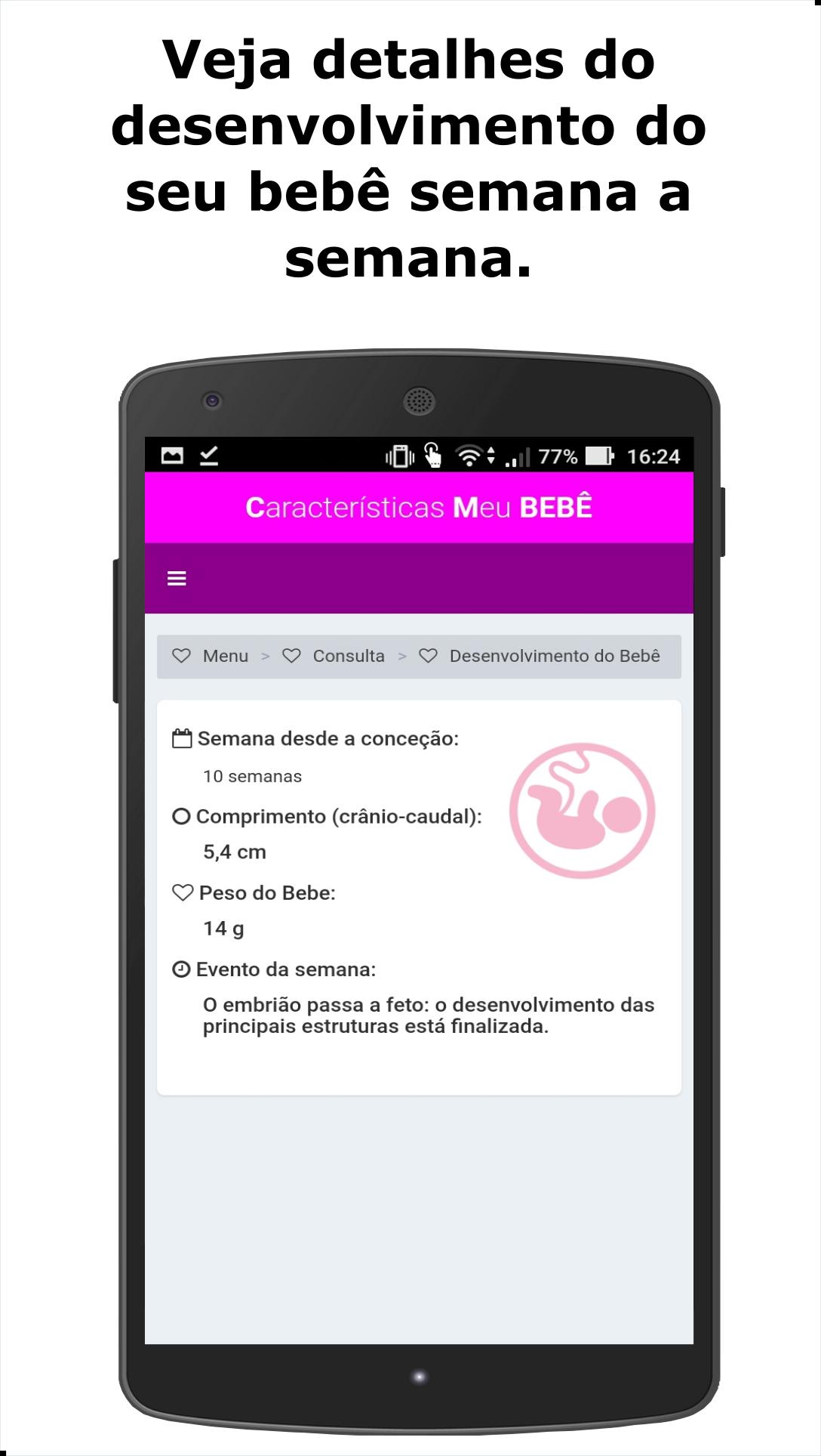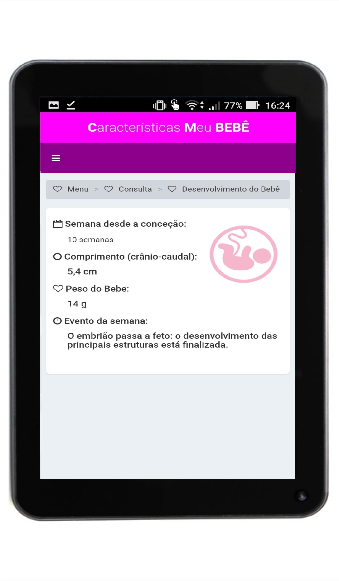 - Nesta opção você selecionará a semana e poderá ver vários detalhes do seu bebê como, o comprimento esperado (crânio-caudal), o peso esperado para a semana, e como está a formação do seu bebê, na opção (Evento da semana) você terá o status de como está a formação dos olhos, boca, órgãos vitais, como por exemplo o evento da semana 4 ( Inicia-se a fase embrionária. Os batimentos cardíacos são visíveis através de uma ecografia.)