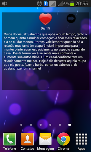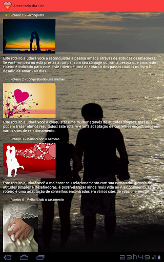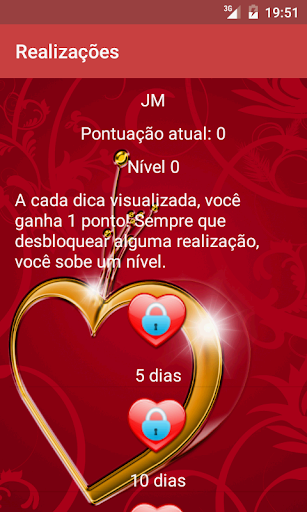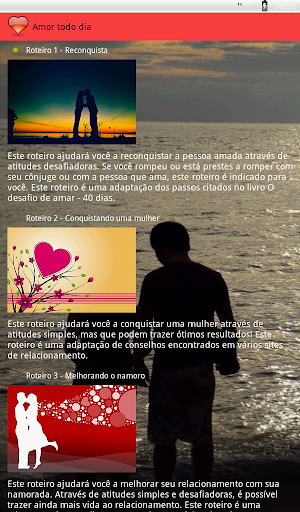 Este aplicativo irá orientá-lo todos os dias através de roteiros elaborados para conquistar ou reconquistar a pessoa amada. Diferentes roteiros podem ser escolhidos, dependendo do objetivo do usuário.