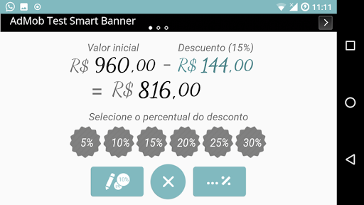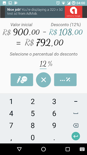 Calcular descontos nunca foi tão simples: digite o valor, toque no botão com o percentual desejado, e pronto! O cálculo será realizado e exibido automaticamente!