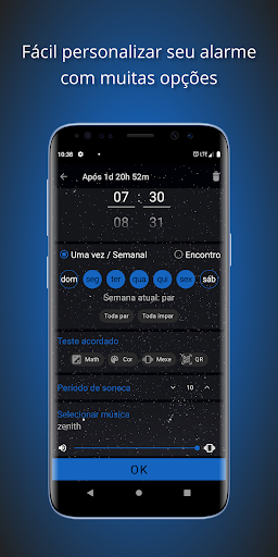 As configurações flexíveis de horário ajudarão você a definir o despertador no dia da semana (a opção “semana ímpar/par” é suportada) ou em datas específicas. Há também uma opção para configurar rapidamente um alarme único não repetitivo.