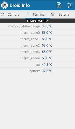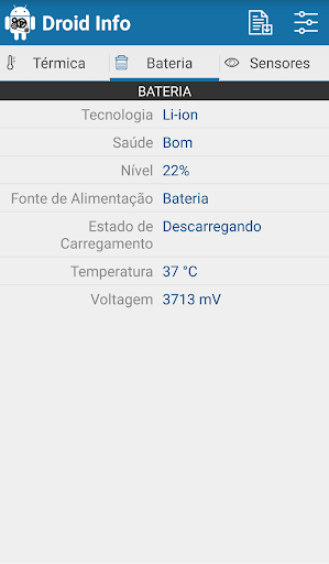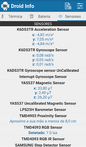 - Sensores: Todos os sensores no seu dispositivo com testes em tempo real.