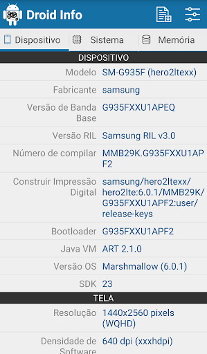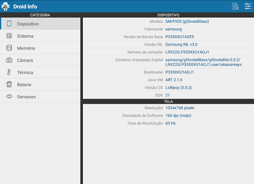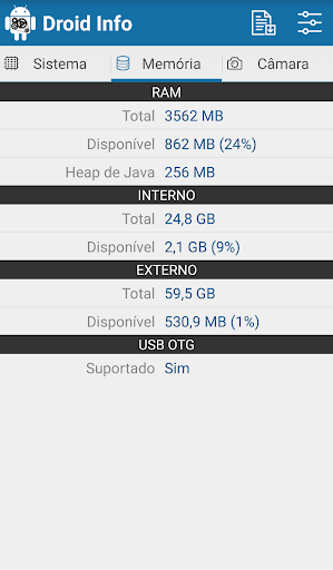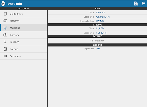 - Memória: RAM total e disponível, assim como informação de armazenamento sobre o seu dispositivo.
