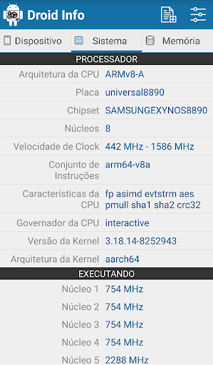 - Sistema: Arquitetura da CPU, Placa, Número de Núcleos, Velocidade do Clock, Opções da CPU, informação sobre Governador e Kernel. Assim como a atual Utilização do CPU, processos de execução totais, e a frequência de clock de cada processador.
