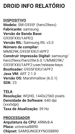 - Dispositivo: Modelo, Fabricante, Chipset, Número de Fabrico e versão do Android OS.