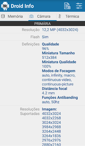 - Câmara: Informação detalhada sobre as câmaras primária e secundária do seu telefone. Juntamente com resoluções suportadas, modos de focagem e função AntiBanding.