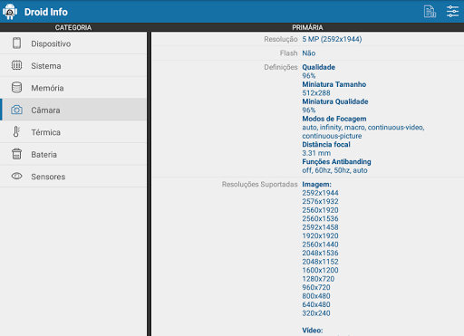 A Droid Info é uma aplicação de especificação do hardware para Android com informação detalhada sobre o seu smartphone, incluindo detalhes do dispositivo, sistema, memória, câmara, temperatura, bateria e sensores. Pode também esperar um relatório completo do seu Smartphone.