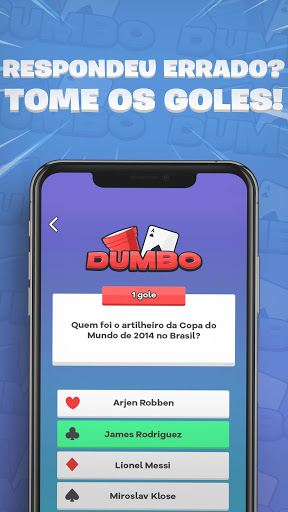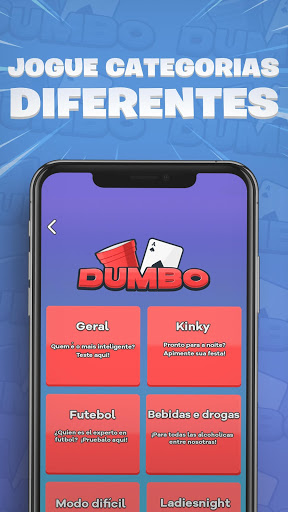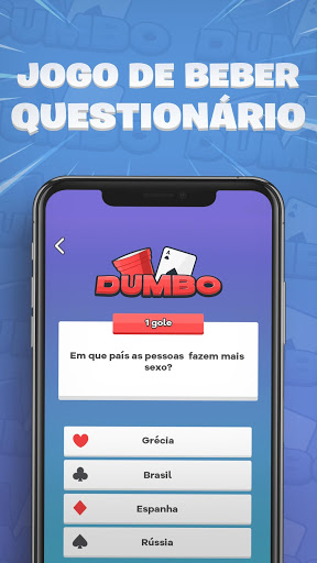 Dumbo é um jogo de bebida grátis para festas que você pode jogar completamente offline. Suporta no mínimo dois jogadores, mas pode ser jogado com grupos grandes.